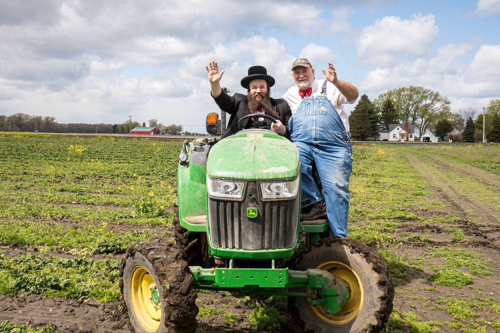 Alexander Rapaport, ED of Masbia Soup Kitchen Network, & Farmer Lee Jones waving while riding a tractor at The Chef's Garden 2021