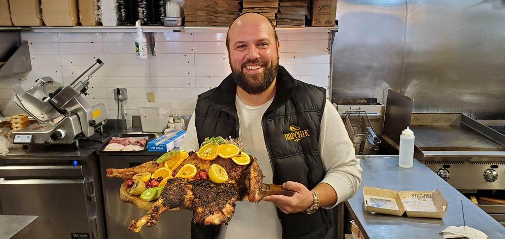 Chef Berish Rapaport with a Roasted Turkey Garnished with Orange Slices in the Yapchik Kitchen