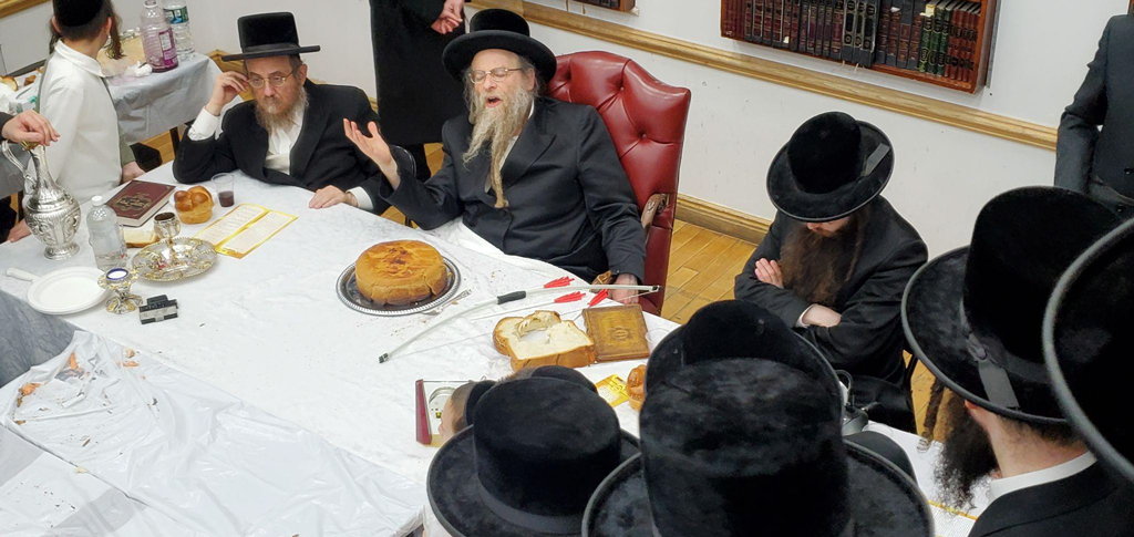 Kosov Rebbe, Rabbi Shraga Feivish Hager Z"l, with large round kugel during the tish for Log Beomer 2022