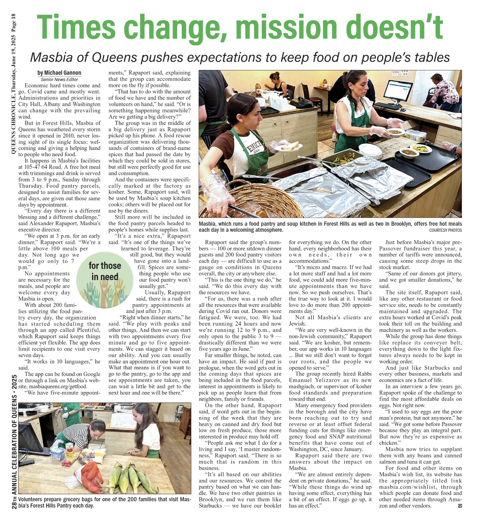 (Queens Chronicle) -- Economic hard times come and go. Covid came and mostly went. Administrations and priorities in City Hall, Albany and Washington can change with the prevailing wind. But in Forest Hills, Masbia of Queens has weathered every storm since it opened in 2010, never losing sight of its single focus: welcoming and giving a helping hand to people who need food. It happens in Masbia’s facilities at 105-47 64 Road. A free hot meal with trimmings and drink is served from 3 to 9 p.m., Sunday through Thursday. Food pantry parcels, designed to assist families for several days, are given out those same days by appointment. “Every day there is a different blessing and a different challenge,” said Alexander Rapaport, Masbia’s executive director. “We open at 3 p.m. for an early dinner,” Rapaport said. “We’re a little above 100 meals per day. Not long ago we would go only to 7 p.m.” No appointments are necessary for the meals, and people are welcome every day Masbia is open. With about 200 families utilizing the food pantry every day, the organization has started scheduling them through an app called Plentiful, which Rapaport said keeps things efficient yet flexible. The app does limit recipients to one visit every seven days. “It works in 10 languages,” he said. The app can be found on Google or through a link on Masbia’s website, masbiaqueens.org/getfood. “We have five-minute appointments,” Rapaport said, explaining that the group can accommodate more on the fly if possible. “That has to do with the amount of food we have and the number of volunteers on hand,” he said. “Or is something happening meanwhile? Are we getting a big delivery?” The group was in the middle of a big delivery just as Rapaport picked up his phone. A food rescue organization was delivering thousands of containers of brand-name spices that had passed the date by which they could be sold in stores, but still were perfectly good for use and consumption. And the containers were specifically marked at the factory as kosher. Some, Rapaport said, will be used by Masbia’s soup kitchen cooks; others will be placed out for use by the diners. Still more will be included in the food pantry parcels headed to people’s homes while supplies last. “It’s a nice extra,” Rapaport said. “It’s one of the things we’ve learned to leverage. They’re still good, but they would have gone into a landfill. Spices are something people who use our food pantry won’t usually get.” Usually, Rapaport said, there is a rush for pantry appointments at and just after 3 p.m. “Right when dinner starts,” he said. “We play with peaks and other things. And then we can start with two appointments every five minute and go to five appointments. We can stagger it based on our ability. And you can usually make an appointment one hour out. What that means is if you want to go to the pantry, go to the app and see appointments are taken, you can wait a little bit and get to the next hour and one will be there.” Rapaport said the group’s numbers — 100 or more sitdown dinner guests and 200 food pantry visitors each day — are difficult to use as a gauge on conditions in Queens overall, the city or anywhere else. “This is the one thing we do,” he said. “We do this every day with the resources we have. “For us, there was a rush after all the resources that were available during Covid ran out. Donors were fatigued. We were, too. We had been running 24 hours and now we’re running 12 to 9 p.m., and only open to the public 3 to 9 — drastically different than we were five years ago in June.” Far smaller things, he noted, can have an impact. He said if past is prologue, when the word gets out in the coming days that spices are being included in the food parcels, interest in appointments is likely to pick up as people learn that from neighbors, family or friends. On the other hand, Rapaport said, if word gets out in the beginning of the week that they are heavy on canned and dry food but low on fresh produce, those more interested in produce may hold off. “People ask me what I do for a living and I say, ‘I master randomness,” Rapaport said. “There is so much that is random in this business. “It’s all based on our abilities and our resources. We control the pantry based on what we can handle. We have two other pantries in Brooklyn, and we run them like Starbucks — we have our booklet for everything we do. On the other hand, every neighborhood has their own needs, their own accommodations.” “It’s micro and macro. If we had a lot more staff and had a lot more food, we could add more five-minute appointments than we have now. So we push ourselves. That’s the true way to look at it. I would love to do more than 200 appointments day.” Not all Masbia’s clients are Jewish. “We are very well-known in the non-Jewish community,” Rapaport said. “We are kosher, but remember, our app works in 10 languages ... But we still don’t want to forget our roots, and the people we opened to serve.” The group recently hired Rabbi Emanuel Yelizarov as its new mashgiach, or supervisor of kosher food standards and preparation toward that end. Many emergency food providers in the borough and the city have been reaching out to try and reverse or at least offset federal funding cuts for things like emergency food and SNAP nutritional benefits that have come out of Washington, DC, since January. Rapaport said there are two answers about the impact on Masbia. “We are almost entirely dependent on private donations,” he said. “While these things do wind up having some effect, everything has a bit of an effect. If eggs go up, it has an effect.” Just before Masbia’s major pre-Passover fundraiser this year, a number of tariffs were announced, causing some steep drops in the stock market. “Same of our donors got jittery, and we got smaller donations,” he said. The site itself, Rap